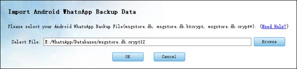 Locate to the WhatsApp folder you saved from Android Phone in step 4 on your computer. Select the WhatsApp backup database file(msgstore.db.crypt12) and then click "OK" to continue.