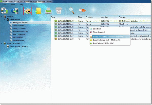 Tip: Or you can right click the device title in the left Devices list and then choose "Extract Media Files from MMS". See as the following screen.