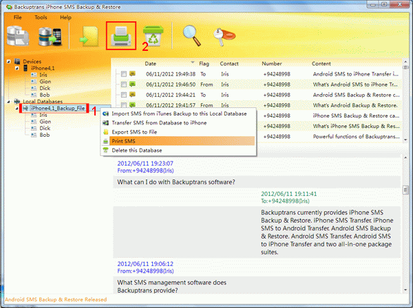 Tip: If you have backed up SMS from iPhone to a database file on computer with Backuptrans iPhone SMS Backup & Restore, you can also print SMS from the database any time you want, even without your iPhone connected.